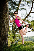 Młoda piękna dziewczyna robi ćwiczenia fizyczne w parku.