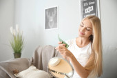 Piękna młoda kobieta krem za pomocą aloe vera extract w domu
