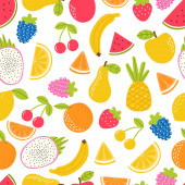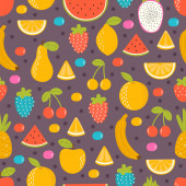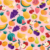 Kreskówki, owoce i jagody na różowym tle. Jednolity wzór włókienniczych i projektowania
