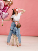 Pozytywne, młoda matka z młodym synem. Piękna blondynka z jej synka, skoki