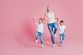 Zdjęcie "Pozytywne, młoda matka z młodym synem. Piękna blondynka z jej synka, skoki" może być wykorzystywane do celów osobistych i komercyjnych zgodnie z warunkami zakupionej licencji Royalty-free. Obraz jest dostępny do pobrania w jakości wysokiej rozdzielczości do 5760x3840.