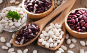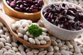 Skład z miską fasoli nerkowej na drewnianym stole.