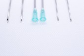 Kaniuli. Na białym tle na białym igły medyczne. Zdjęcia makro