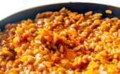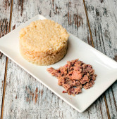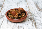 Płyta z białym ryżem na czarnej fasoli z łyżką drewna