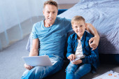 Zdjęcie "Przystojny mężczyzna przyjemny elektrowni fotowoltaicznej, siedząc z synem." może być wykorzystywane do celów osobistych i komercyjnych zgodnie z warunkami zakupionej licencji Royalty-free. Obraz jest dostępny do pobrania w jakości wysokiej rozdzielczości do 5760x3840.