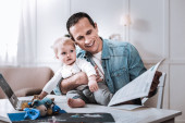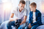 Przystojny mężczyzna przyjemny elektrowni fotowoltaicznej, siedząc z synem.
