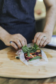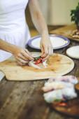 Zdjęcie "Kobieta przygotowuje lato rolki faszerowane warzywa świeże" może być wykorzystywane do celów osobistych i komercyjnych zgodnie z warunkami zakupionej licencji Royalty-free. Obraz jest dostępny do pobrania w jakości wysokiej rozdzielczości do 5760x3840.
