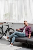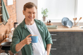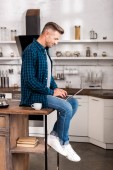 przystojny uśmiechnięty człowiek gospodarstwa filiżankę kawy i przy użyciu smartfona siedząc na stole w kuchni