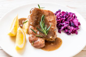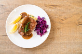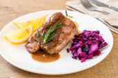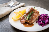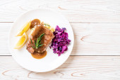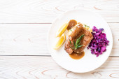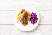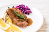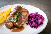Stek wieprzowy z czerwoną kapustą i ziemniakami puree na białym talerzu