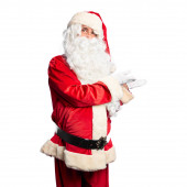 Boże Narodzenie koncepcja. Santa Claus trzyma portret zbliżenie wizytówki na białym tle.