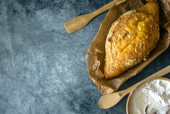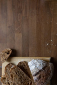 Bochenek chleba i kawałki chleba na płycie na tle kamień