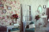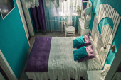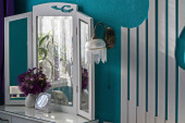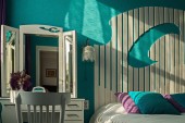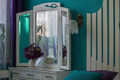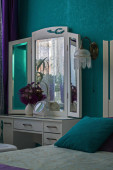 Toaletka i łóżko z zagłówkiem oryginalny. Turkusowa sypialnia Apartament St. Petersburg.