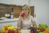 Zdrowa młoda kobieta w kuchni z owoców i warzyw i soków