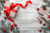 Stare drewno tło z gałęzi jodły ozdobiona bombkami i szyszki. Miejsca na tekst. Kartki świąteczne. Widok z góry. Boże Narodzenie prezenty.