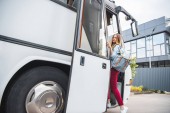 przycięte zdjęcie mężczyzna turysty z plecaka chodzenie do podróży autobus miejski Street