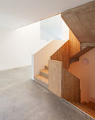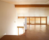 Pusty biały pokój z drewnianymi belkami stropowymi. Nikt nie wewnątrz