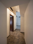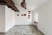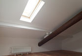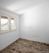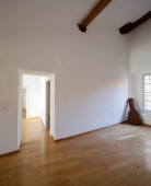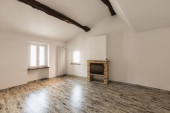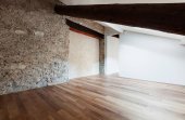 Pusty biały pokój z drewnianymi belkami stropowymi. Nikt nie wewnątrz