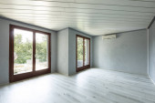 Pusty biały pokój z drewnianymi belkami stropowymi. Nikt nie wewnątrz