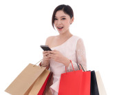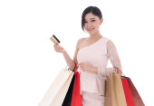 Szczęśliwa kobieta trzyma karty kredytowej i torba na zakupy na białym tle na białym tle