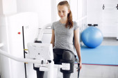 Zdjęcie "Kobieta spaceru z kulami w fizjoterapii" może być wykorzystywane do celów osobistych i komercyjnych zgodnie z warunkami zakupionej licencji Royalty-free. Obraz jest dostępny do pobrania w jakości wysokiej rozdzielczości do 5760x3840.