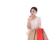 Młoda kobieta, zakupy i za pomocą cyfrowego tabletu na białym tle na białym tle