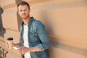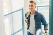 szczęśliwy turysta mężczyzna z plecaka pozowanie w pobliżu podróży autobusem na ulicy miasta