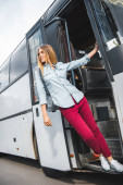 przystojny mężczyzna z plecakiem, zaraz po wyjściu z podróży autobus miejski Street