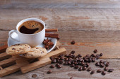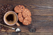 Filiżankę kawy i serca kształcie maślane ciasteczka na vintage drewniane tła, widok z góry