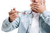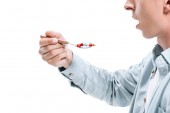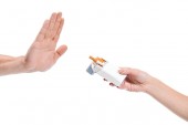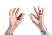 wykadrowanego obrazu człowieka w ubranie, łamanie niezdrowe papierosa na białym tle