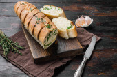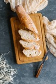 Widok z góry z cięcia bochenek chleba na drewnianą deską do krojenia na ciemnym blatem