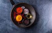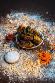 Zbliżenie z popularnych indyjskich ogórkowy z wszystkich jego składników, w tym przyprawy i zioła na powierzchni drewnianych w ciemnych kolorach Gothic