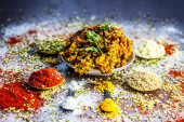 Zdjęcie "Zbliżenie z popularnych indyjskich ogórkowy z wszystkich jego składników, w tym przyprawy i zioła na powierzchni drewnianych w ciemnych kolorach Gothic" może być wykorzystywane do celów osobistych i komercyjnych zgodnie z warunkami zakupionej licencji Royalty-free. Obraz jest dostępny do pobrania w jakości wysokiej rozdzielczości do 5760x3840.