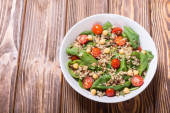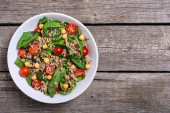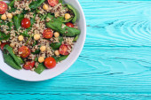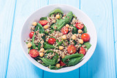 Zdjęcie "Szpinaku Sałatka z ciecierzycą, pomidory i quinoa. Wegańskie zdrowe pożywienie" może być wykorzystywane do celów osobistych i komercyjnych zgodnie z warunkami zakupionej licencji Royalty-free. Obraz jest dostępny do pobrania w jakości wysokiej rozdzielczości do 5760x3840.