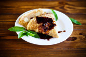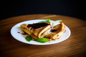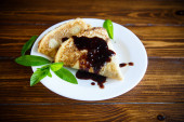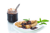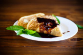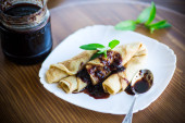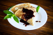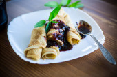 cienkie smażone naleśniki z dżemem w płycie na drewnianym stole