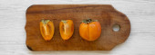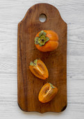 Świeży persimmon na stolnicy na białym tle drewnianych, widok z góry. Mieszkanie świeckich, nad głową, z góry. Skopiować obszar przestrzeni i tekst.