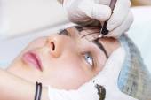 Kosmetyczka oddziela rzęsy z igłą. Laminowanie Botox i rzęs. Zabiegi kosmetyczne.