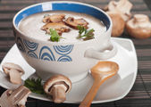 Smaczny puree zupa grzybowa w drewniane miski ze składników. Koncepcja zdrowej żywności. Rustykalne drewniane tła. Przekrój poziomy. Miejsce