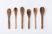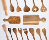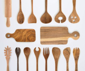 Przybory kuchenne zestaw drewniany widelec, łyżka i naczynia na białym tle.