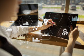 Zdjęcie "Płci męskiej i żeńskiej architektów pracy z holograficzne Augmented Reality Model 3d miasta. Zawodowej osób zaawansowanych technologicznie Office za pomocą oprogramowanie do modelowania rzeczywistości wirtualnej." może być wykorzystywane do celów osobistych i komercyjnych zgodnie z warunkami zakupionej licencji Royalty-free. Obraz jest dostępny do pobrania w jakości wysokiej rozdzielczości do 5760x3840.
