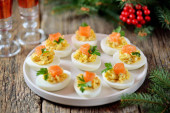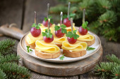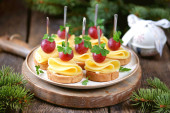 Canap na szaszłyk z bagietki chleb z tosty ser, kiełbasa, pomidor, ogórek i oliwki. Tradycyjne przekąski na nowy rok.