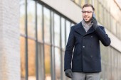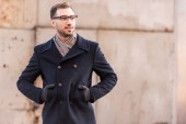 przystojny stylowy mężczyzna w płaszczu z parasolem, chodzenie przez jesienny street