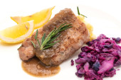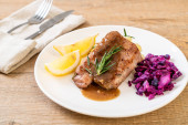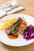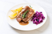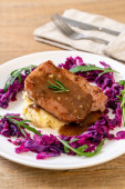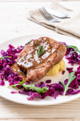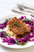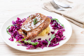 Stek wieprzowy z czerwoną kapustą i ziemniakami puree na białym talerzu