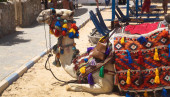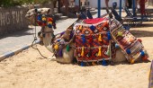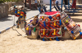 Leżąc na plaży pusty wielbłąd zwierzę. ssak w stroju narodowego. Kultura Egiptu. Zdjęcie