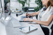 Projektant graficzny nieczytelna kobieta za pomocą pióra w biurze.