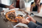 przycięte strzał uśmiechający się młodych współpracowników, patrząc na pysznej pizzy w biurze