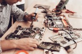 Master gadżety. Naprawy gadżety. Mąż Master. Części zamienne i sprzęt na stole. Człowiek czyni naprawy przy stole. Weź w rękę telefon. Kobieta daje telefon pracownika serwisu. Naprawa telefonów. Pracownik serwisu.