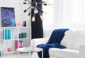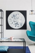 Księżyc i kosmos grafiki na ścianę stylowy biały salon z kolorowe dodatki, prawdziwe zdjęcie