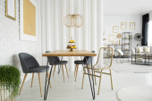Krzesła czarny drewniany stół z jedzeniem w szary Pokój dziecięcy z roślin i lampa. Prawdziwe zdjęcie