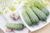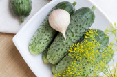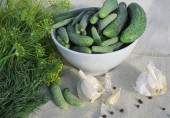 Na tabeli ogórki, przeznaczony do wytrawiania szkła konta bankowego i niezbędne przyprawy: pietruszka, czosnek, koperek, Zieloni.