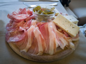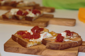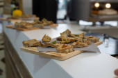 Zakąski: Kawałki Focaccia nadziewane z gotowanej szynki i różne sosy.
